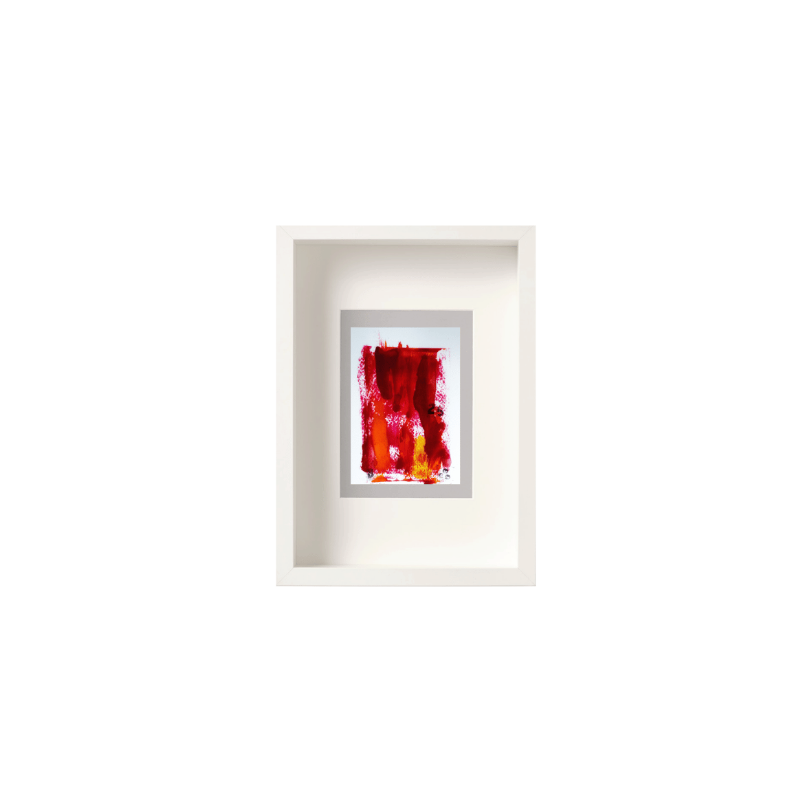 • Quadro com pintura abstrata em vermelho, laranja e amarelo numa moldura branca.