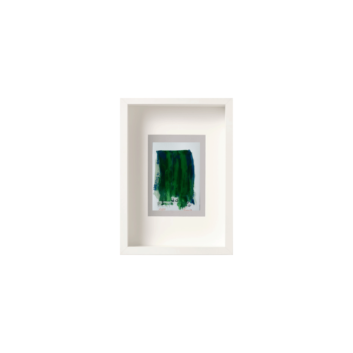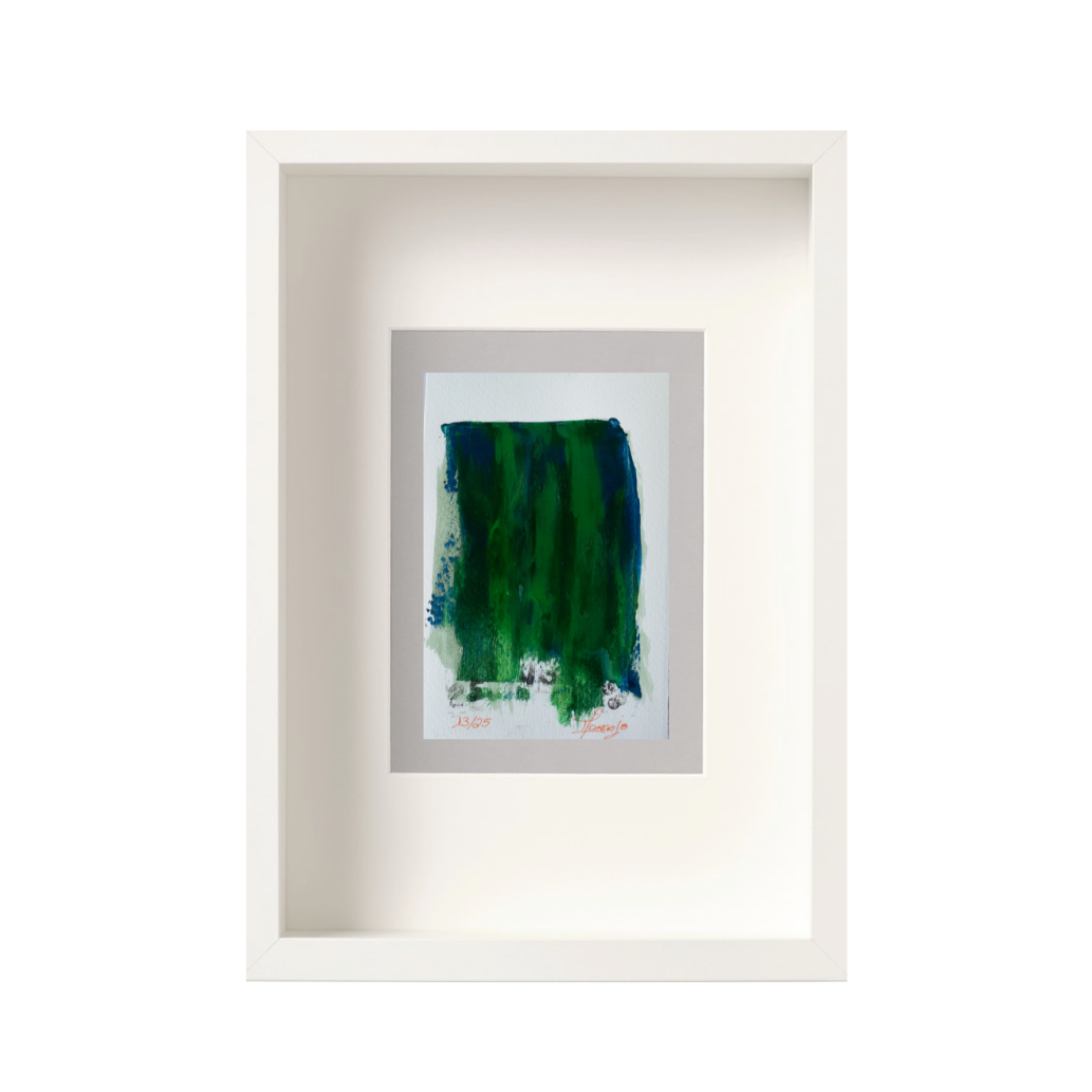• Quadro decorativo com pintura abstrata verde e azul em moldura branca
